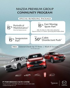 Diskon 15% Periodical Maintenance: Berlaku bagi pemilik Mazda yang sudah tidak masuk dalam cakupan My Mazda Service. Perawatan berkala kini jadi lebih terjangkau.